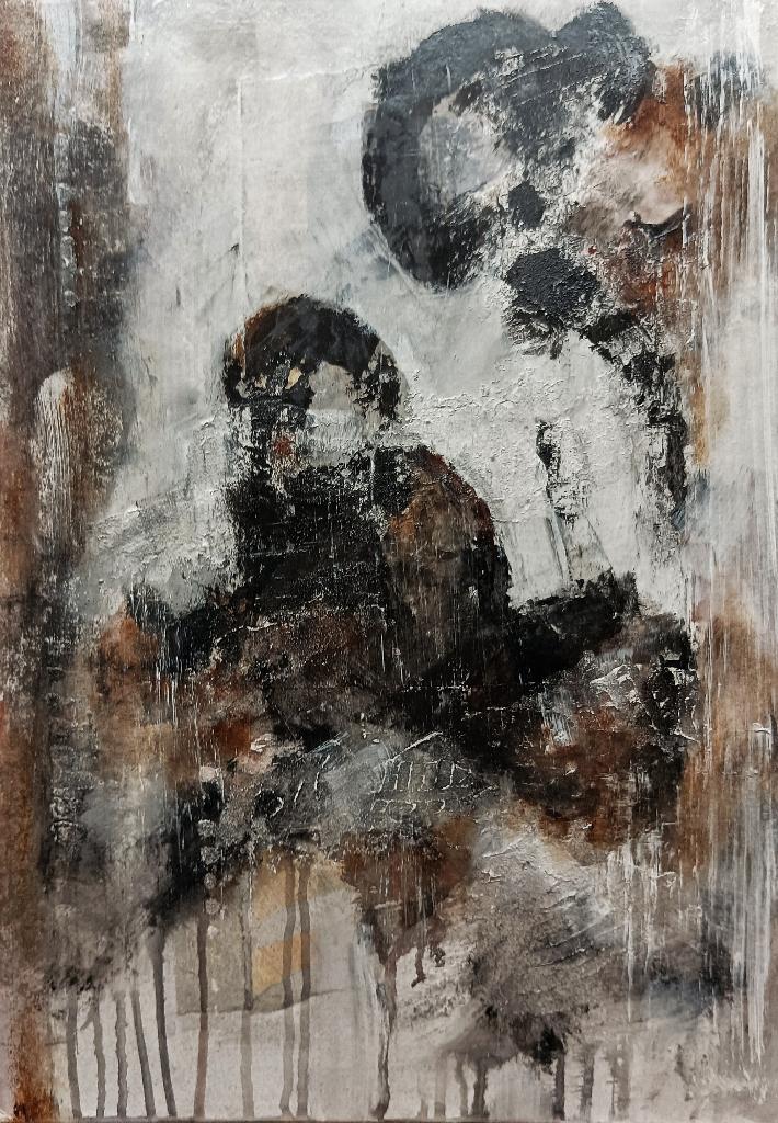 My eyes wander across the studio — some works still in drawing, others already complete. They pause on this one. Framed, small in format, mixed media with fragments of collage. I dig through the past and through emotions, and thoughts rise from the boxes of memory. So I’d like to briefly explain what a painting truly is, and what an art lover sees in it — far beyond the decorative surface that blends with walls and furniture.